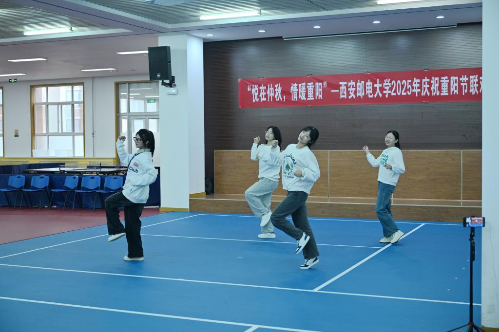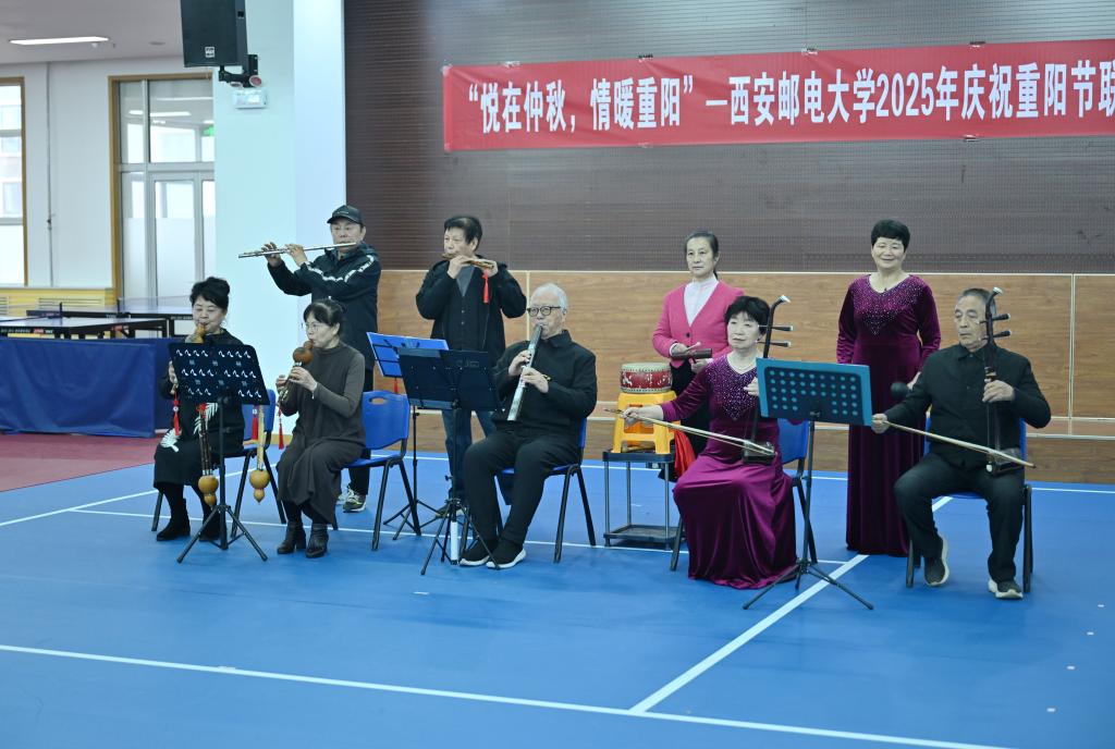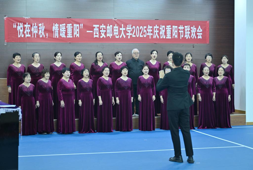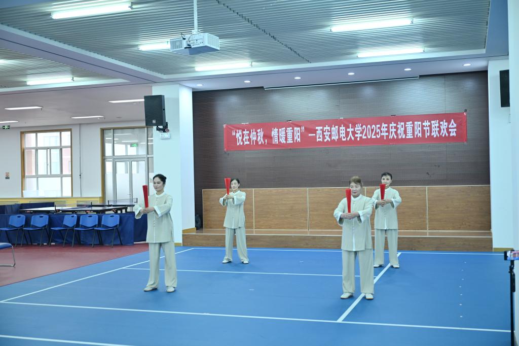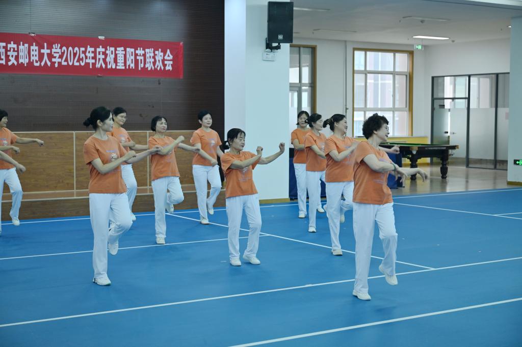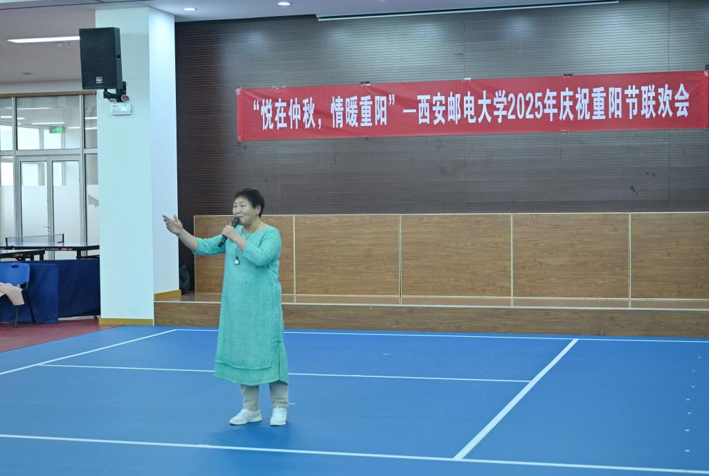 联欢会在舞蹈队乔文智、张艳华等带来的《万泉河水清又清》中拉开帷幕,优美的舞姿瞬间点燃现场气氛。健身操队潘颖遐、林康华演绎的水兵舞《世界赠予我的》活力满满;朗诵班张晓红朗诵的《不朽》情感真挚,引人共鸣;太极拳队张玲、库瑞等展示的太极扇《中国功夫》刚柔并济,尽显中华武术魅力;陈冬红、李玲枝等带来的豫剧《亲家母》韵味十足;西邮学生舞蹈队表演的《用青春致敬》则展现了青春与敬老的美好交融;模特队马武玲、宗时春等带来的《对面的小姐姐》走秀优雅大方;朱秀英演唱的豫剧《花木兰》婉转动人;经济与管理学院辅导员孟祥新的独唱《故乡的云》饱含深情,勾起大家的思乡情怀;朗诵班崔永强、丁婕朗诵的《秋天里的中国》描绘出祖国秋日的壮美画卷;太极拳队张晓红展示的杨式太极刀行云流水;模特队潘颖遐、李雅莉等的旗袍秀《采薇》尽显东方古典美;器乐班薛顺根、李达群等带来的《彩云追月》《梁祝--化蝶》合奏旋律悠扬,令人沉醉。