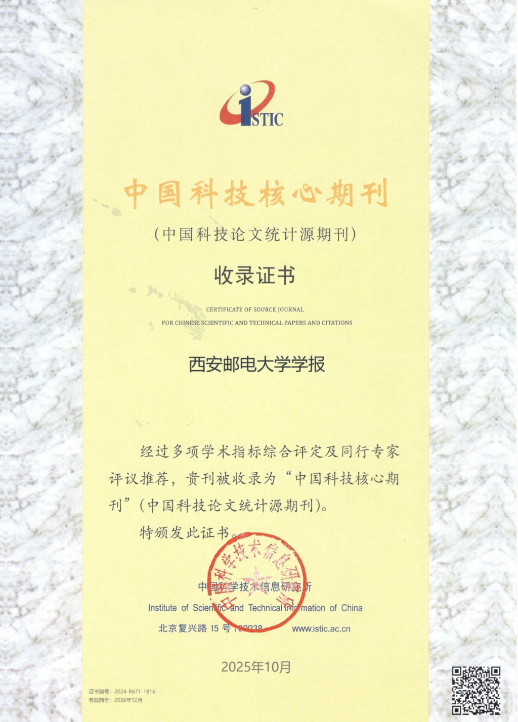 本网讯(通讯员 祝剑)10月30日,中国科学技术信息研究所在北京召开“2025年中国科技论文统计结果发布会”。会议正式公布了《2025年中国科技核心期刊目录》,其中学术卷目录包含自然科学、社会科学等多个领域的期刊,共计2693种。《西安邮电大学学报》自2012年以来连续14次入选中国科技核心期刊。