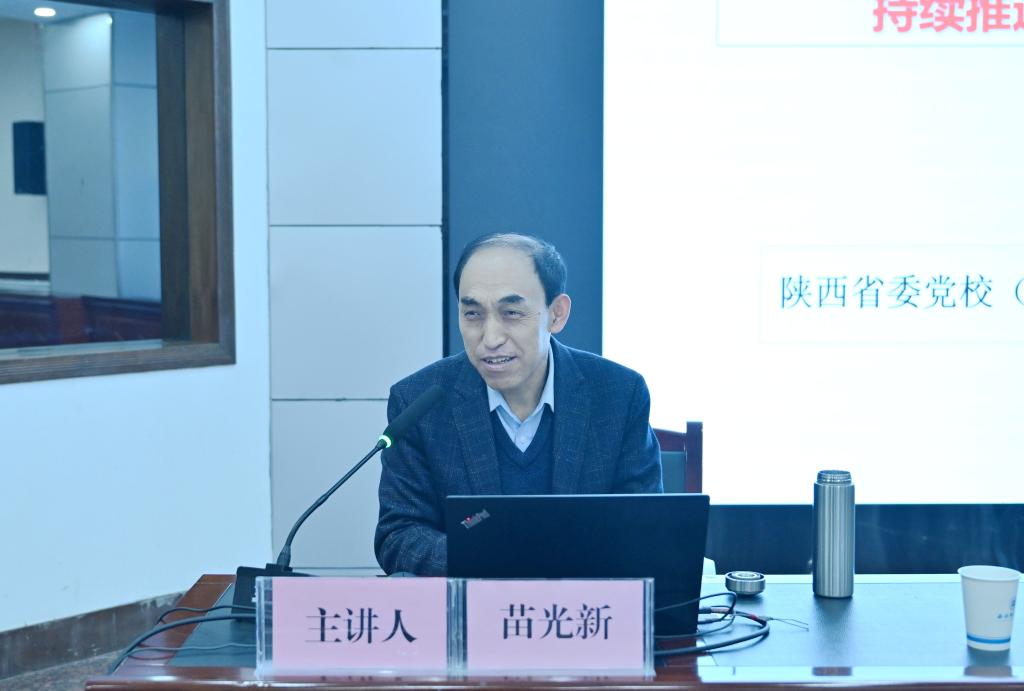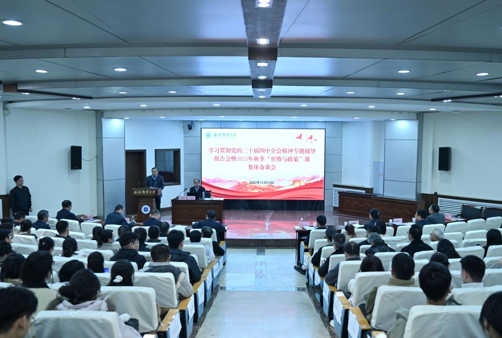 本网讯(通讯员 于文杰 陈光灿)11月14日下午,我校在长安校区办公楼附一楼报告厅举行学习贯彻党的二十届四中全会精神专题辅导报告会暨2025年秋季《形势与政策》课集体备课会,邀请中共陕西省委党校(陕西行政学院)中共党史教研部主任苗光新教授作党的二十届四中全会精神专题辅导报告。全体校领导、全体辅导员、马克思主义学院全体教师、学生代表近300人参加报告会,马克思主义学院院长袁文伟主持会议。