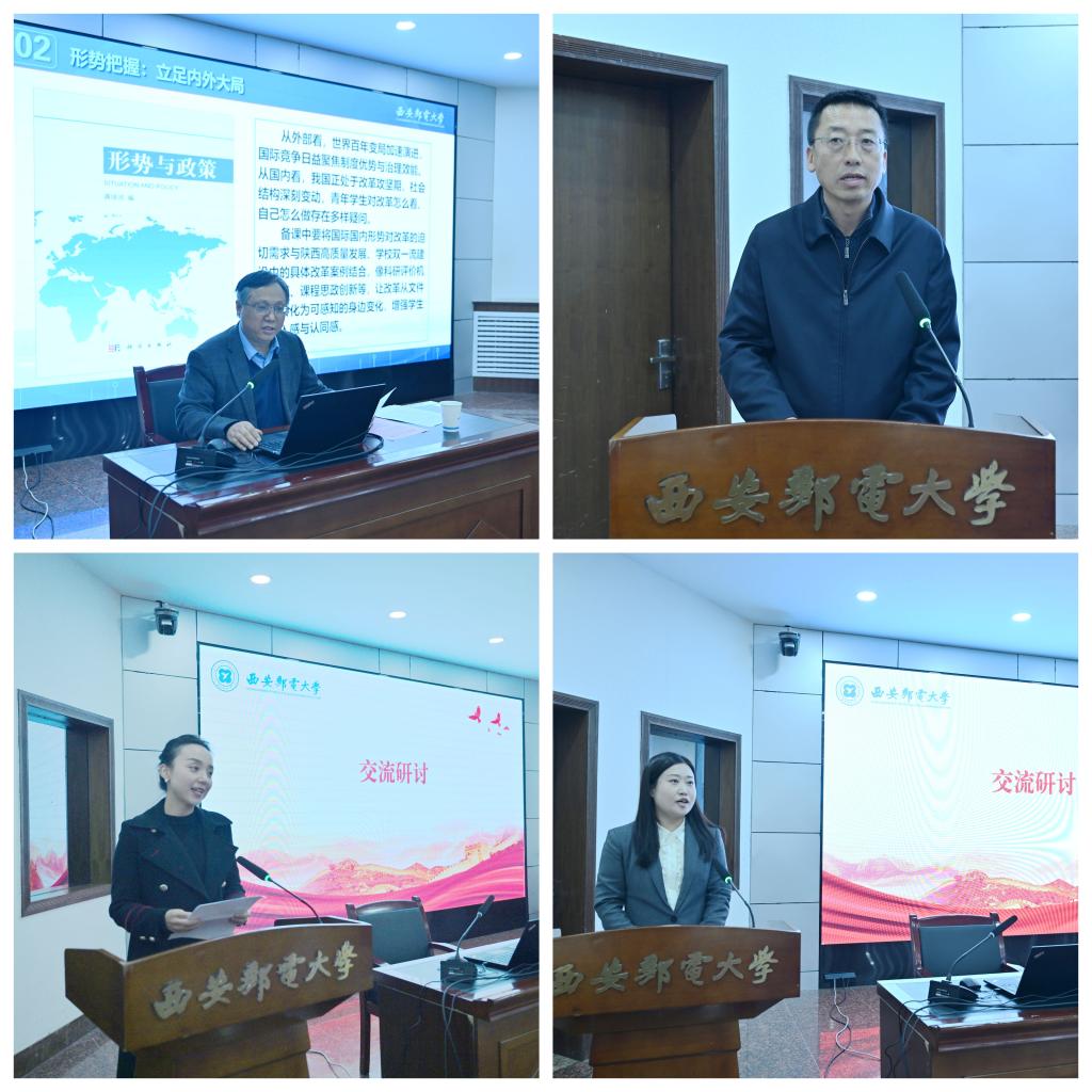 交流研讨环节,副校长楼旭明指出《形势与政策》课是理论武装时效性、释疑解惑针对性、教育引导综合性都很强的高校思想政治理论课,要求教师们要深化学习党的创新理论,熟悉习近平新时代中国特色社会主义思想的核心要义,不断提升自己理论知识和对人文社会科学的敏锐洞察力。希望同学们通过《形势与政策》课的学习能更加全面地了解国内外的形势和政策,增强自己的社会责任感和使命感,为国家和社会的发展贡献青春力量。马克思主义学院青年教师刘雅楠和电子工程学院、集成电路学院辅导员赵金梦分别就如何将党的二十届四中全会精神融入思政课教学与实践进行交流分享。