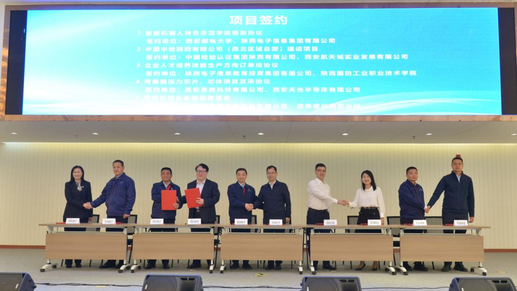 本次对接会共有10个重点合作项目集中签约,涵盖产业链上中下游合作、产学研用深度融合两大领域。其中,我校与陕西电子信息集团有限公司签订共建智能机器人特色示范学院框架协议;与西安和其光电科技股份有限公司签订三种光谱传感与测量技术研发与应用项目。
