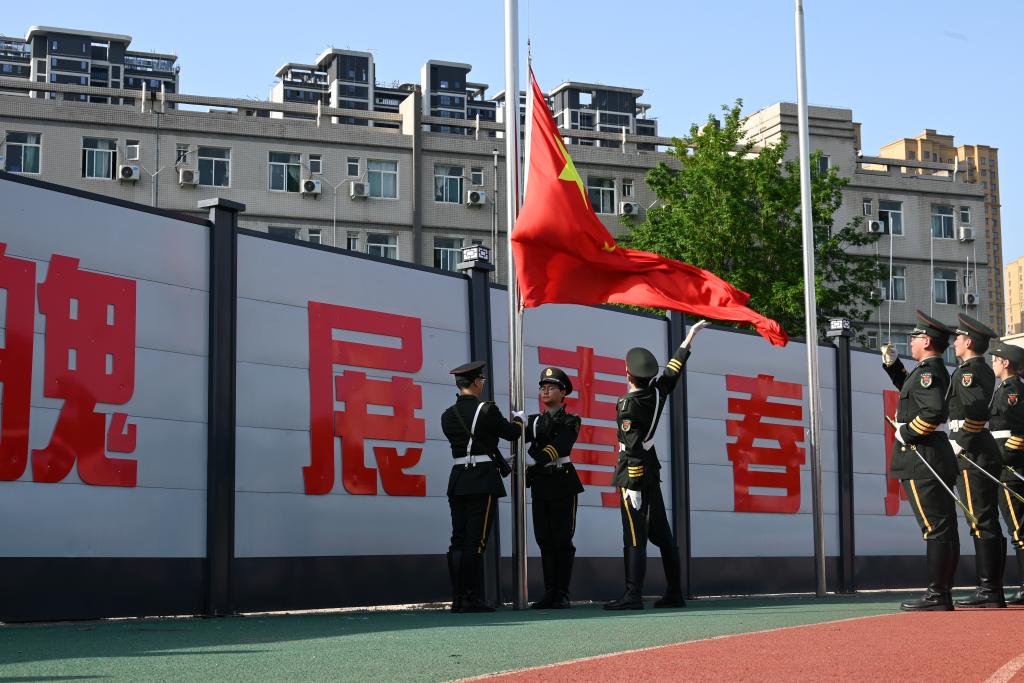 在庄重的升旗仪式上,雄壮激昂的国歌声响彻全场。全体师生肃立注目,心怀赤忱与家国情怀,向冉冉升起的五星红旗致敬。