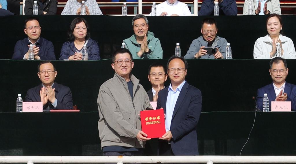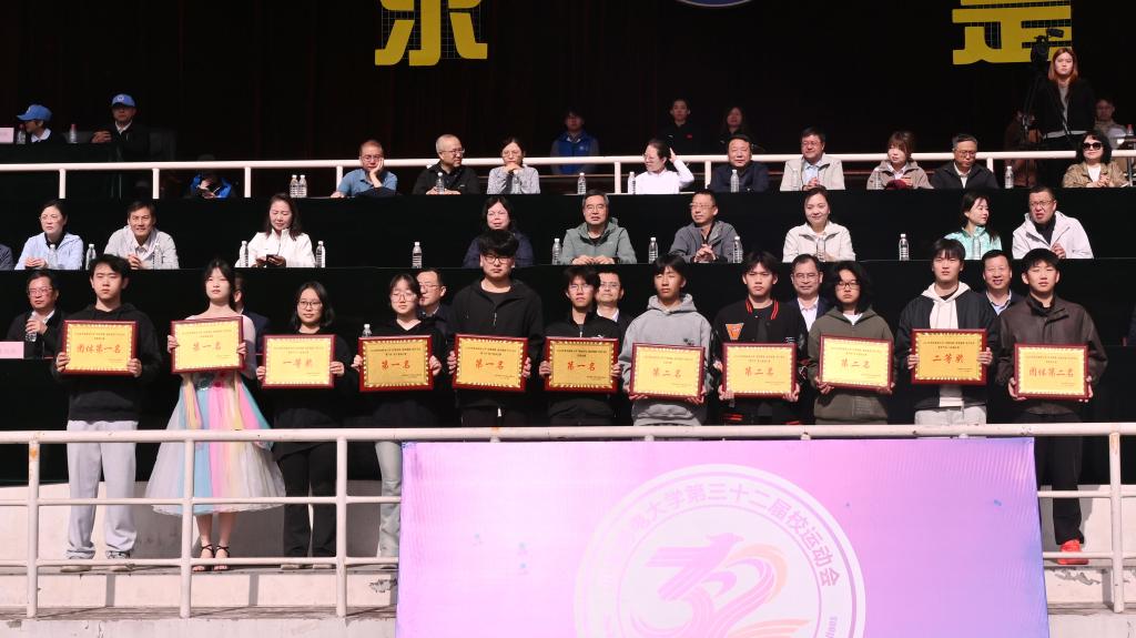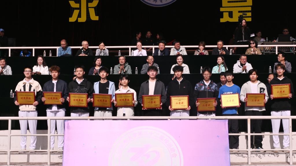 与会校领导、离退休老领导为“培根筑基、强体报国”系列活动、广播体操决赛、大学生体质健康标准测试优秀单位代表颁奖。