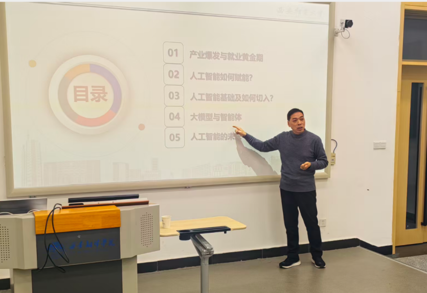 本网讯(通讯员 罗婷)近日,人工智能学院、自动化学院副院长屈军锁教授受邀赴西安翻译学院作人才培养专题报告。西安翻译学院人工智能专业全体师生参加报告会。