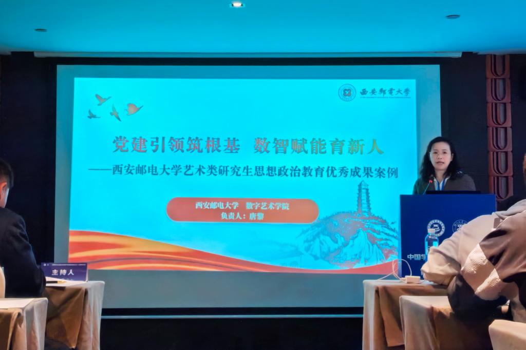 唐黎以《党建引领筑根基 数智赋能育新人——西安邮电大学艺术类研究生思想政治教育优秀成果案例》为题,详细阐述了数智赋能艺术类研究生思想政治工作的理念,并提出“固本、立心、弘道、赋能”的具体举措。她还结合学院的典型案例,展示了学院在文化平台、科研产出、竞赛成绩、以及创新成果等方面的育人成效。