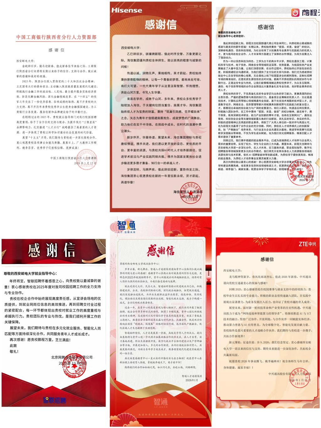 本网讯(通讯员 高妍)近日,学校陆续收到中兴通讯、中国工商银行陕西省分行、海信集团、前程无忧、智联招聘、智通人才等不同行业领域用人单位发来的感谢信。信中,各单位对我校毕业生的专业素养、综合能力和敬业精神给予了高度评价,并对学校在校企合作、人才共育及就业服务等方面的工作表示感谢。